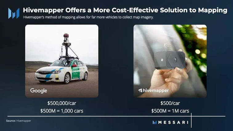 Hivemapper takes an interesting bottom-up approach to building a mapping infrastructure network traditionally built top-down from centralized tech players with deep pockets. By using a token incentive model, contributors are compensated for their data and are willing to continue to provide coverage to the network as they have economic motivation sharing in its success. With the potential for broader, fresher, and higher quality coverage than existing offerings, coupled with lower costs to the end clients, we believe Hivemapper will gain traction and market share over the coming years.