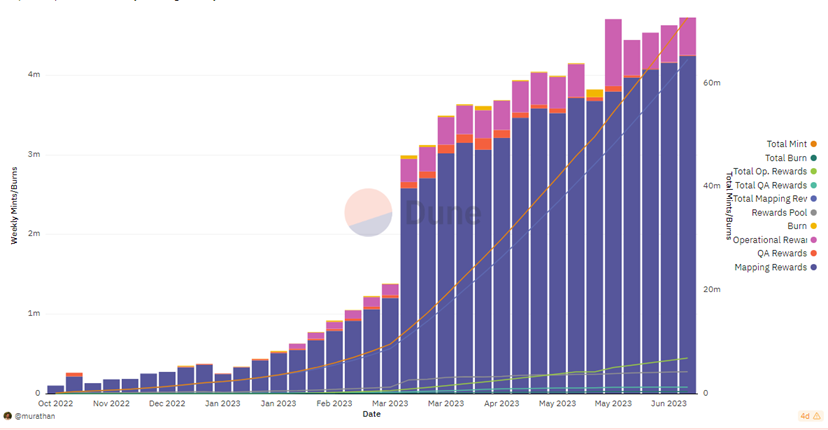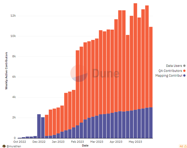 Another KPI we can observe is the total number of contributors to the network. As more contributors come aboard, they further map coverage as well as data quality and freshness, increasing value and thus demand from end clients.