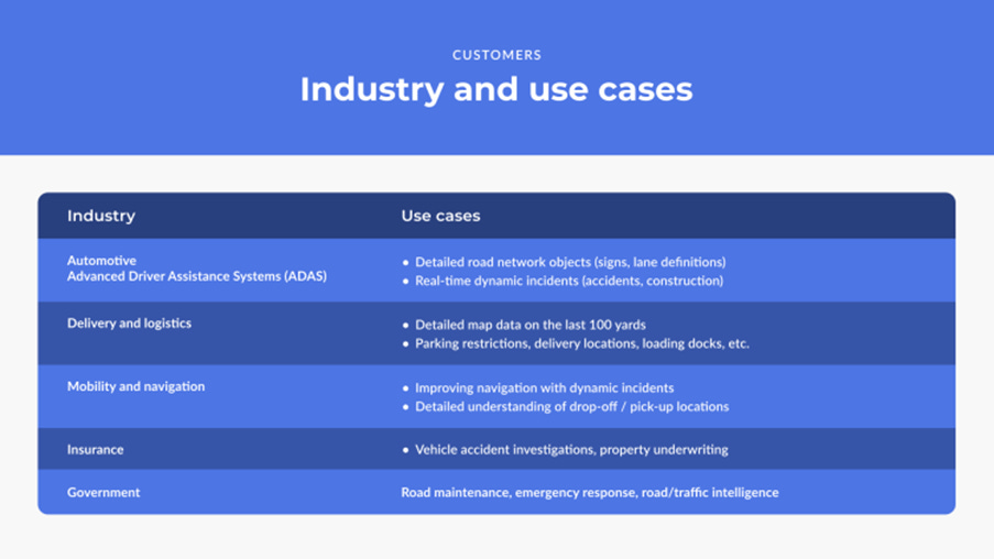 Logistics companies may want to have visuals of loading docks and parking restrictions prior to delivery, as knowing can save them time and money. Governments want to know where road maintenance is necessary, have traffic intelligence, or the fastest routes available for emergency response times.