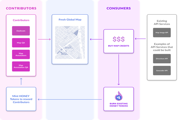 Hivemapper aims to solve these issues. The network’s costs to the end consumer are significantly cheaper because they do not have the high operational or capital expenditures to collect the mapping data. Hivemapper’s data is fresh and up to date as the global network of vehicle dashcams are recording constantly while drivers go about their normal routes. Furthermore, the $HONEY token can incentivize coverage of areas less frequently traveled. $HONEY not only incentivizes and manages behavior on the network, but it also allows for contributors to be compensated for their data as well as be financially aligned in the success of the network.